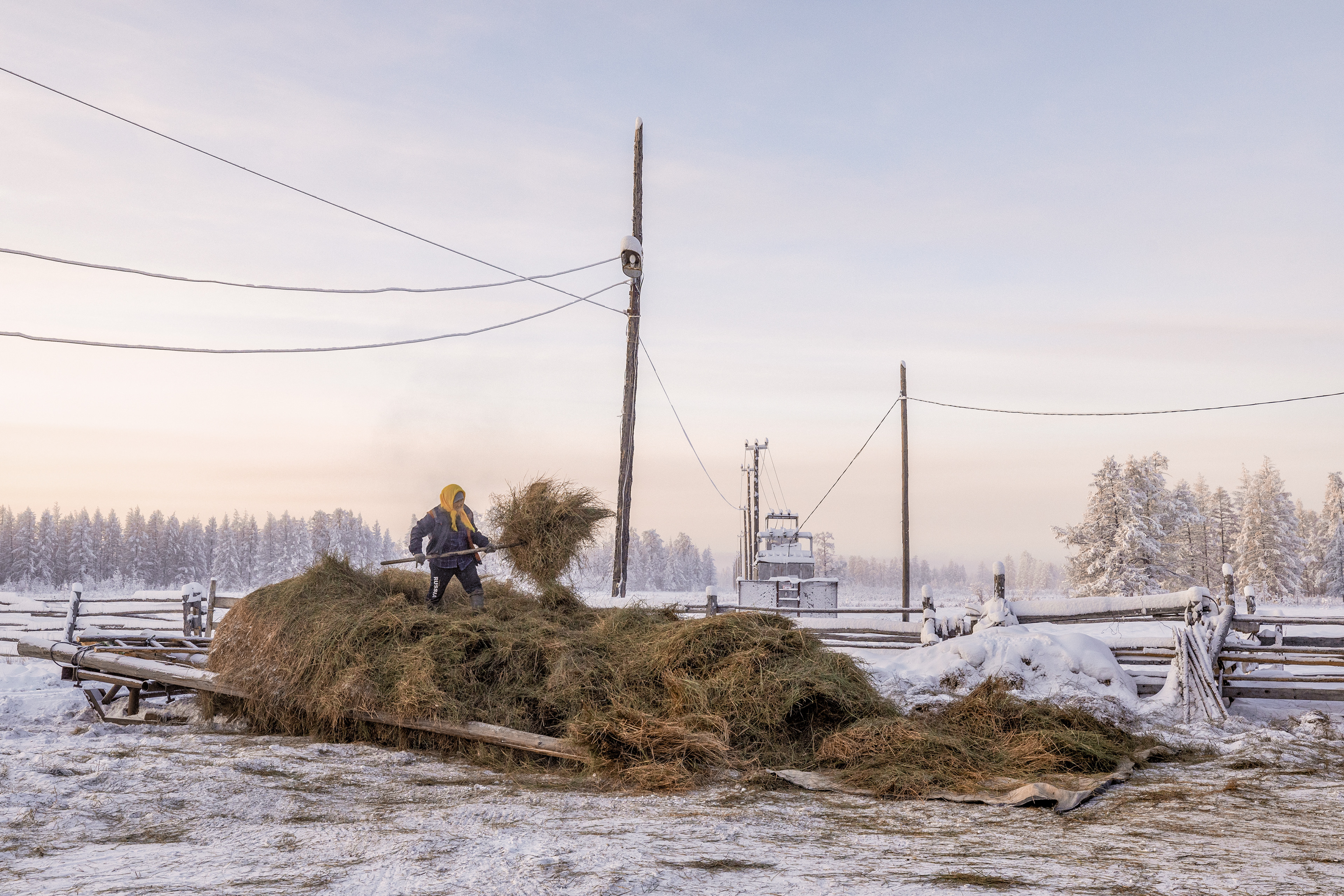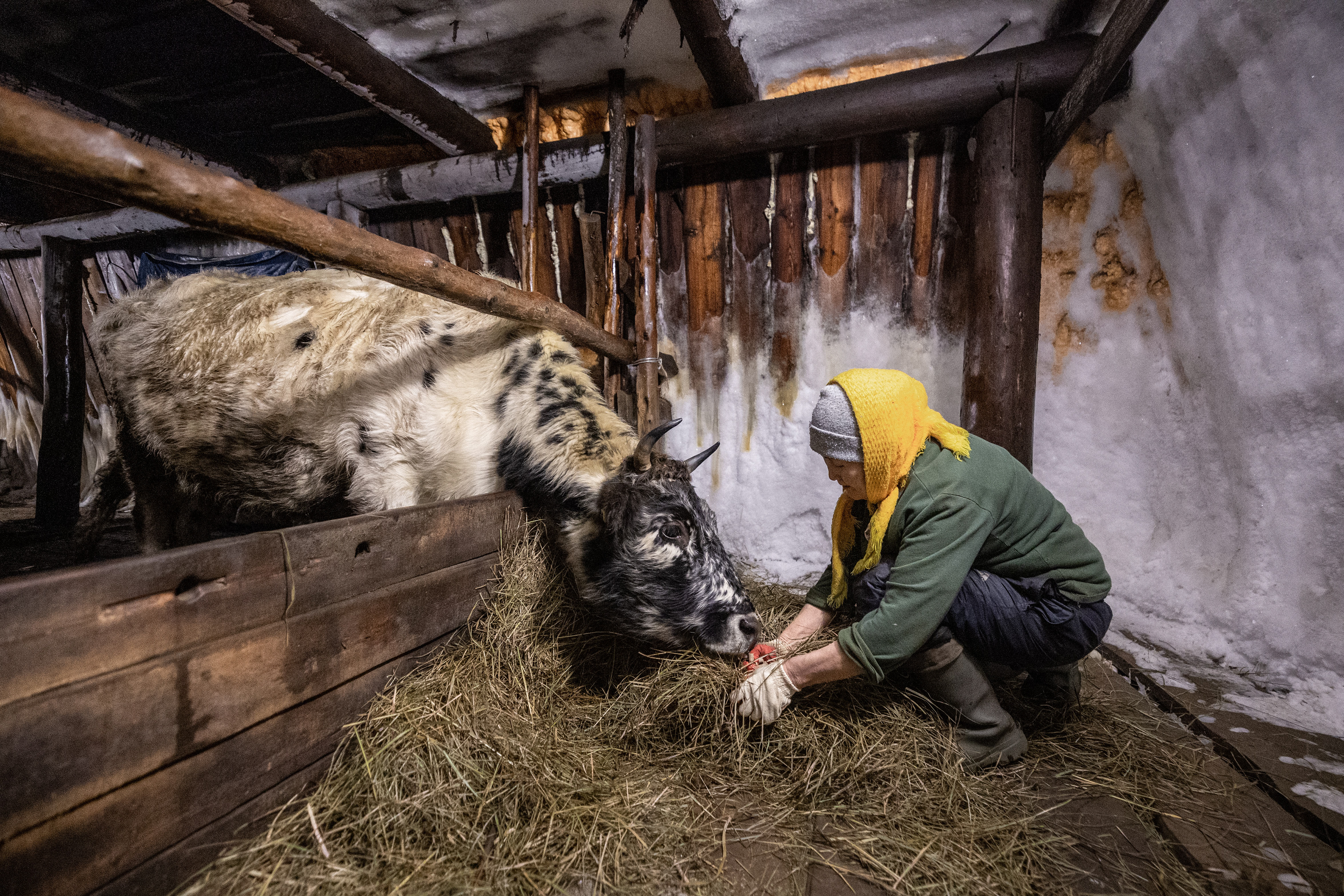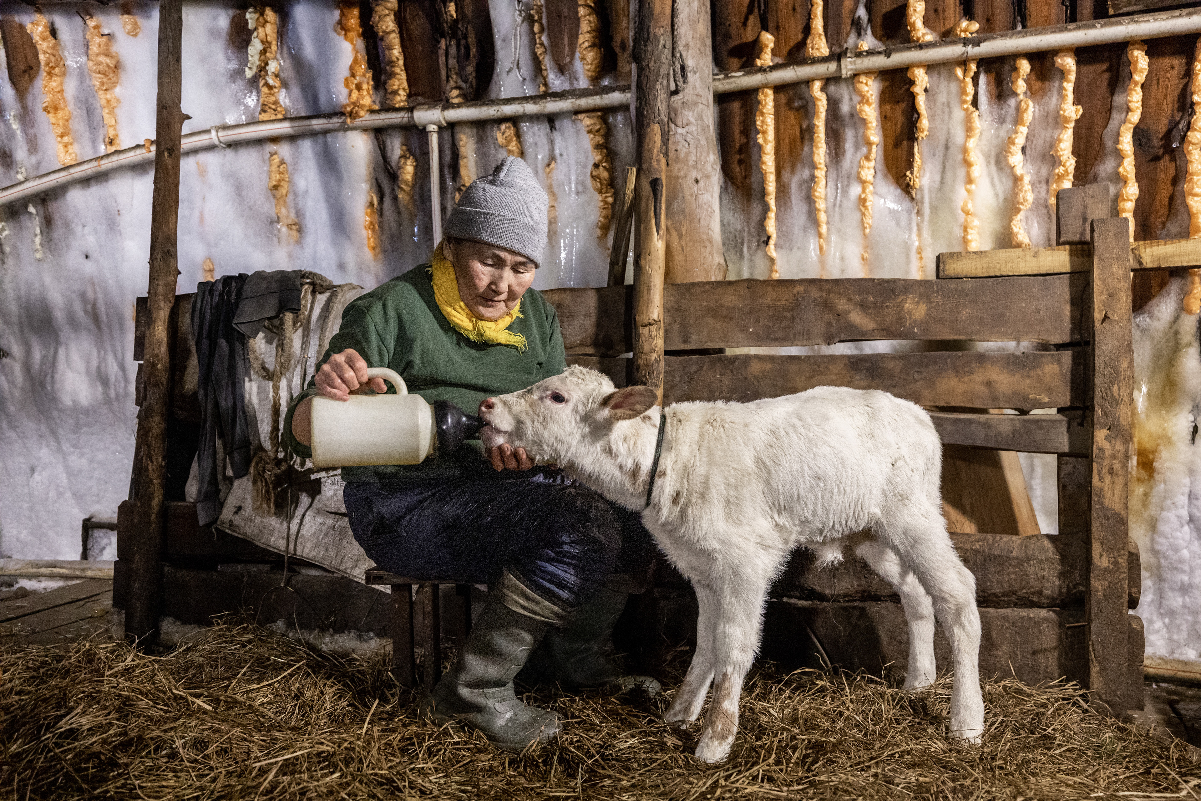 Evdakia, 63, is a freelance cow breeder in Oymyakonsky district from Yakutia, situated in Oriental Siberia, recognized as the coldest permanently inhabited settlement on Earth by winter average temperatures, and known as the Pole of Cold. Despite a rather stable average annual temperature, the region is now experiencing thermal anomalies, heavy snowfall and forest fires. Summer heat, more and more strong, dries out the vegetation necessary for livestock breeding, endangering traditional activities. At her farm, Evdakia raises 47 cows, among which she try to restore the Yakut breed that was replaced at Soviet time by Simmentals. The milk of the Yakut cow is distinguished by a higher percentage of fat content, useful properties and acids and "marble tenderness" meat, very beneficial to health. From her activity of producing milk products and selling meat she earns nearly 150 euros par month. Oymyakonsky district, not having a specific geoclimatic status despite its harsh climate conditions, does not benefit from financial aid for the construction of the infrastructures necessary for daily life and livestock farming. Without running water and central heating, Evdakia braves winter temperatures of around -45°C outside and -15°C in her stable for cows to prepare hay, water and clean the space. Her brother, Ilya, helps her on a daily basis to support her in its passion.