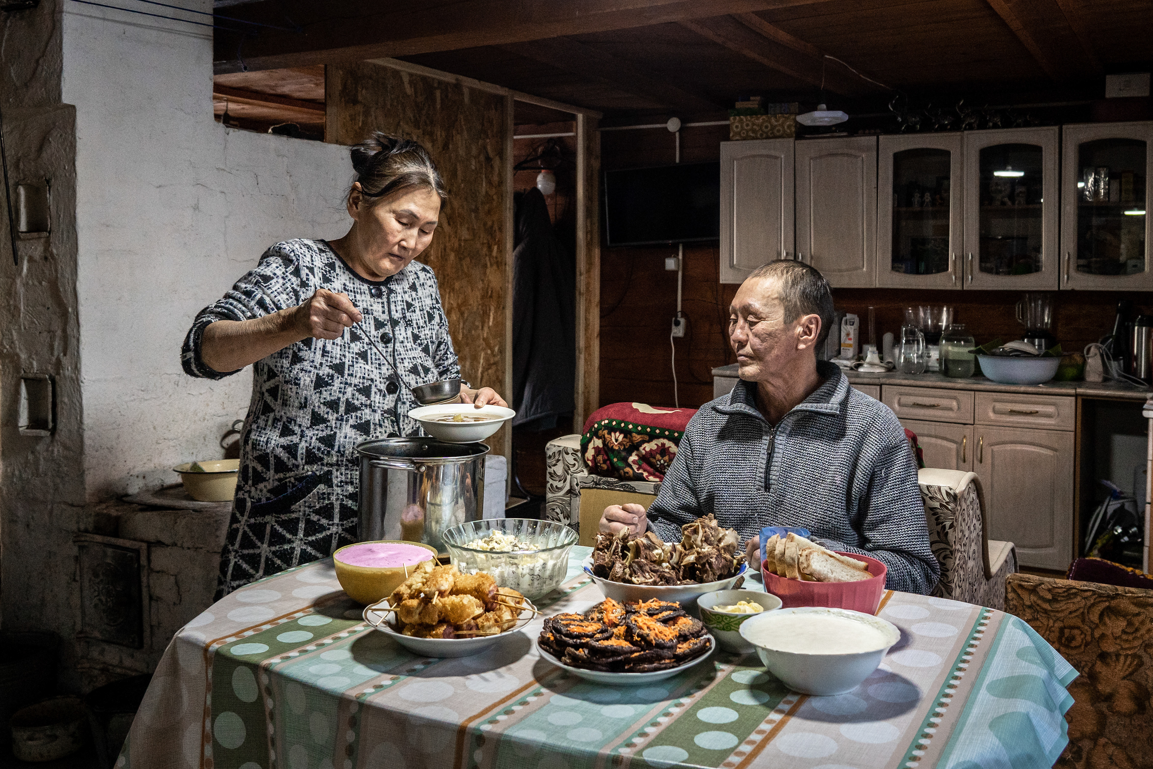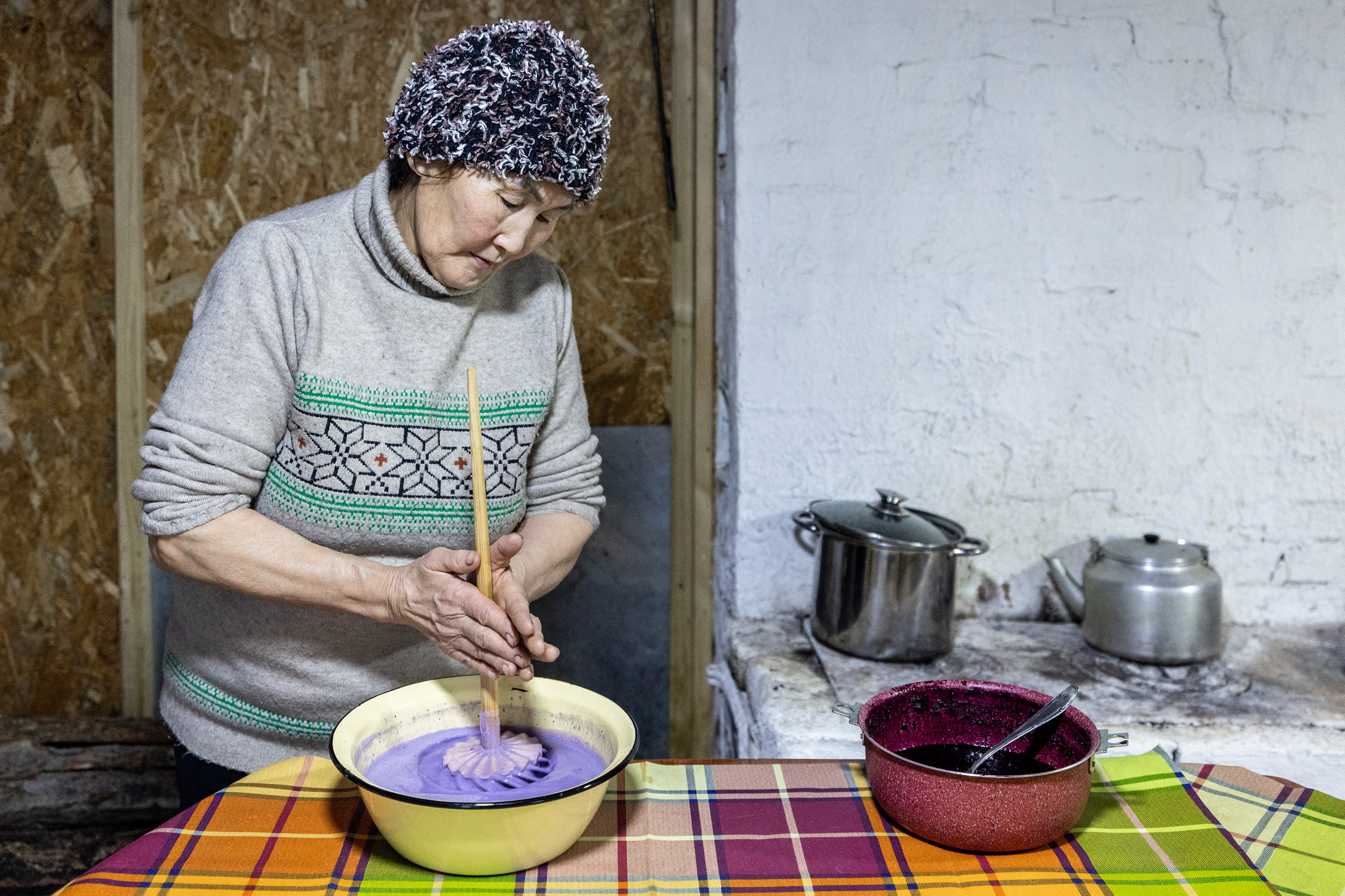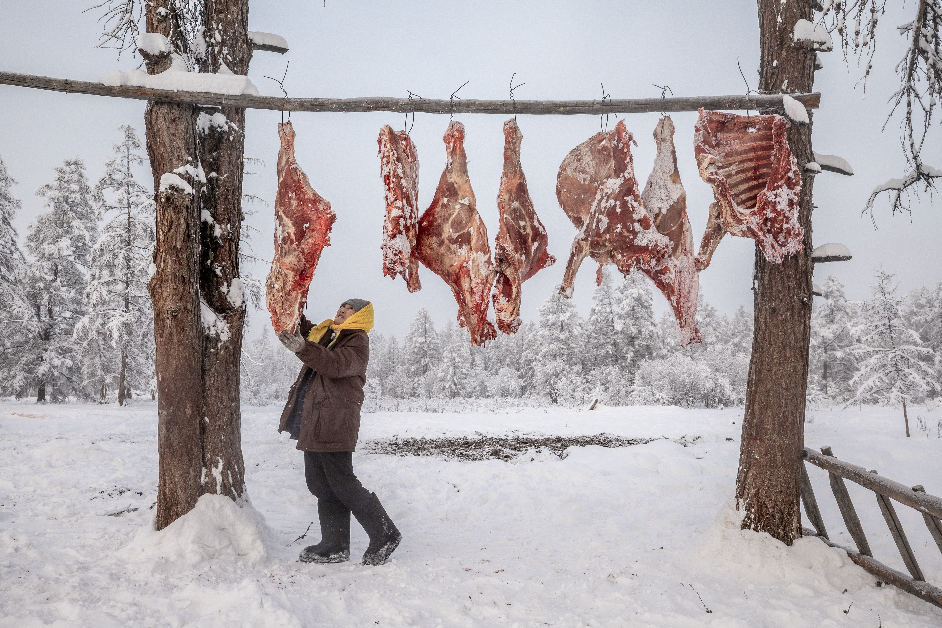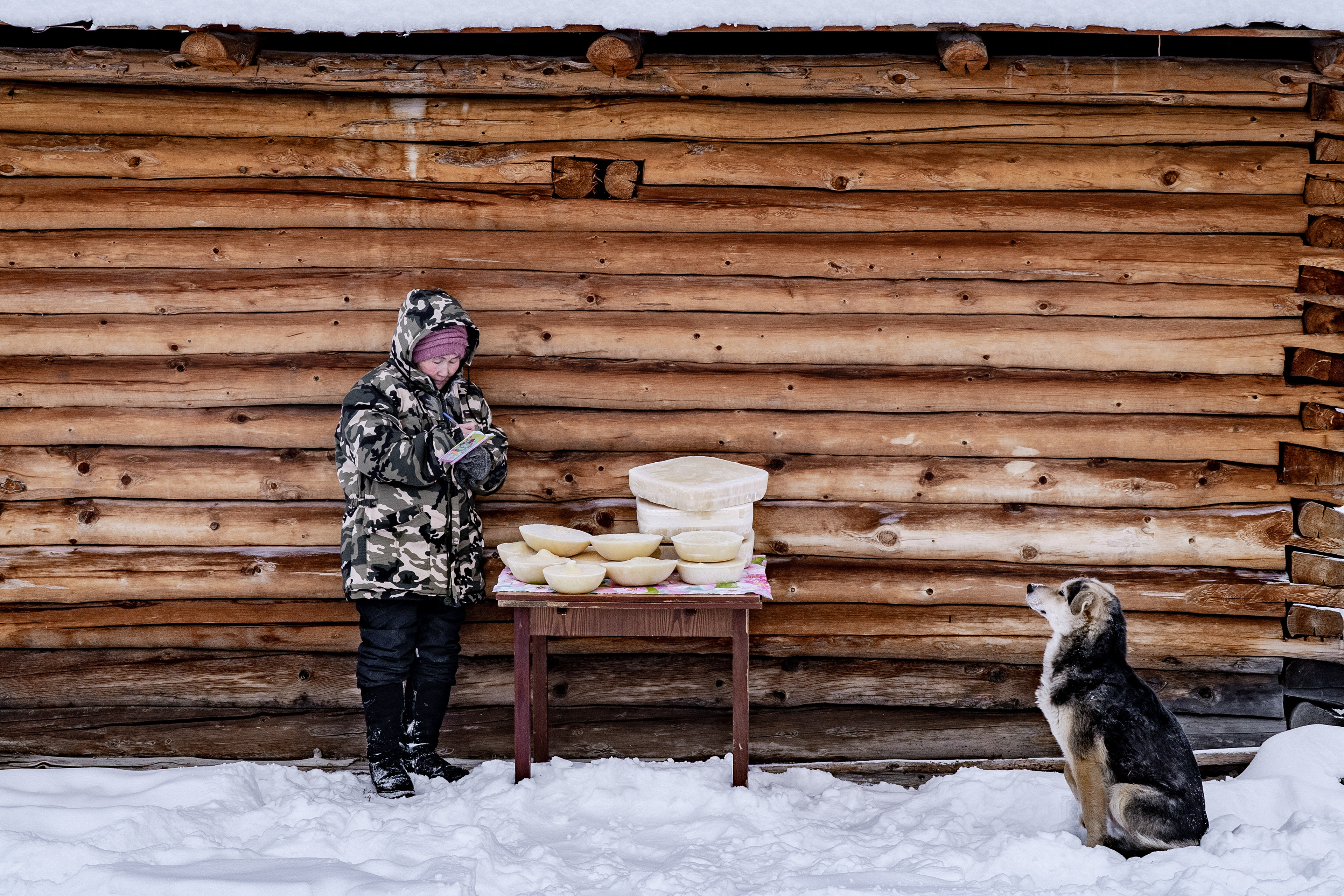 Evdakia, 63, is a freelance cow breeder in Oymyakonsky district from Yakutia, situated in Oriental Siberia, recognized as the coldest permanently inhabited settlement on Earth by winter average temperatures, and known as the Pole of Cold. Despite a rather stable average annual temperature, the region is now experiencing thermal anomalies, heavy snowfall and forest fires. Summer heat, more and more strong, dries out the vegetation necessary for livestock breeding, endangering traditional activities. At her farm, Evdakia raises 47 cows, among which she try to restore the Yakut breed that was replaced at Soviet time by Simmentals. The milk of the Yakut cow is distinguished by a higher percentage of fat content, useful properties and acids and "marble tenderness" meat, very beneficial to health. From her activity of producing milk products and selling meat she earns nearly 150 euros par month. Oymyakonsky district, not having a specific geoclimatic status despite its harsh climate conditions, does not benefit from financial aid for the construction of the infrastructures necessary for daily life and livestock farming. Without running water and central heating, Evdakia braves winter temperatures of around -45°C outside and -15°C in her stable for cows to prepare hay, water and clean the space. Her brother, Ilya, helps her on a daily basis to support her in its passion.