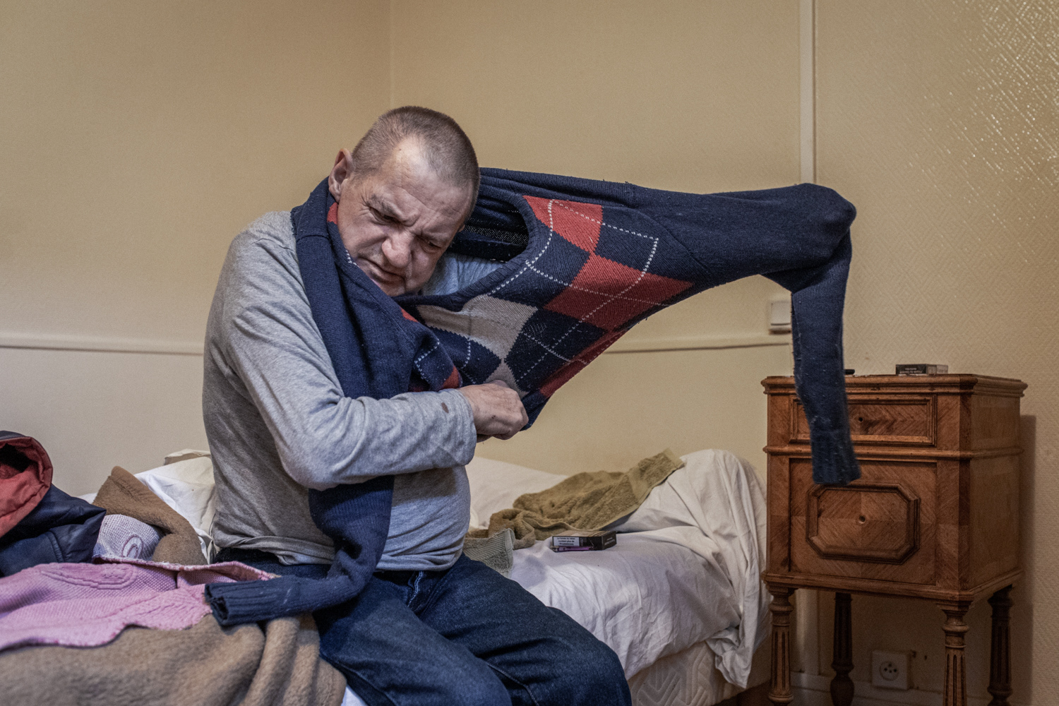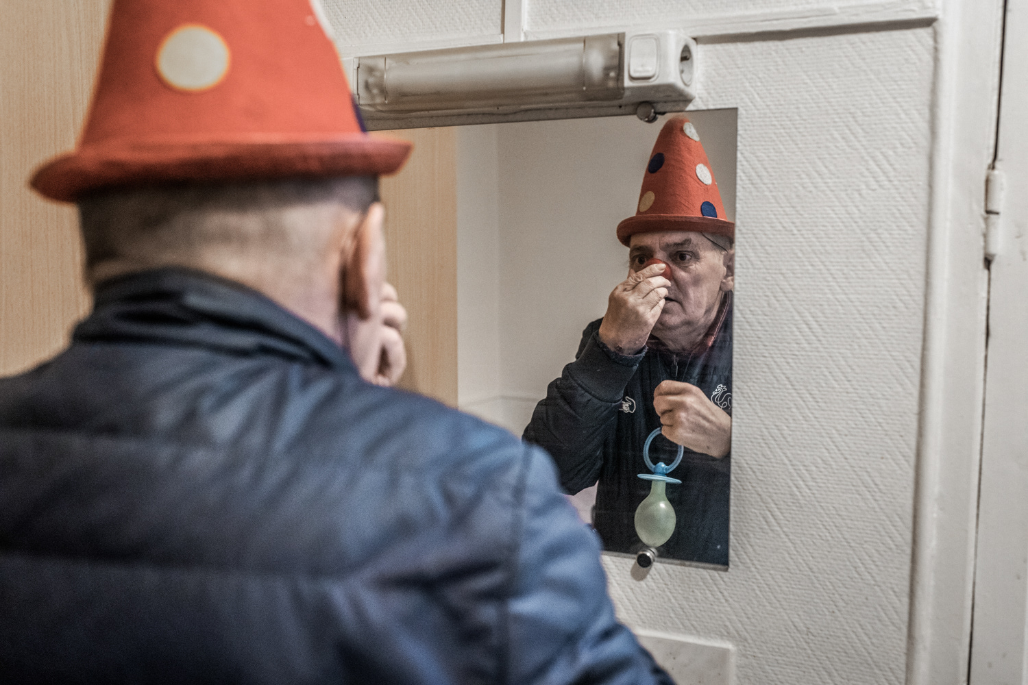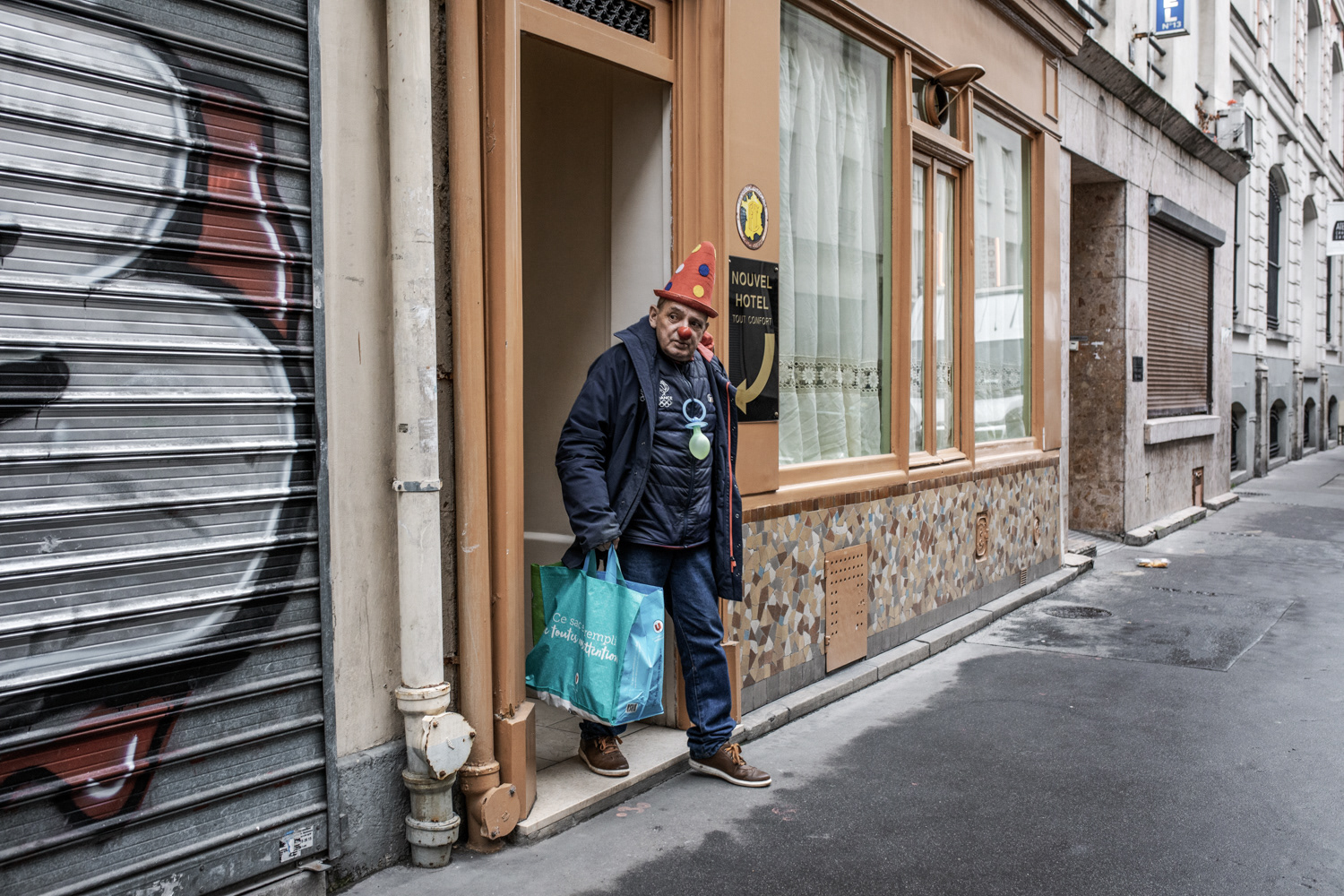 Joël, 65 ans, originaire du Nord-Pas-de-Calais, vit depuis 3 ans dans un hôtel social à Paris 11ème. Boulanger de profession, il est aujourd’hui à la retraite ; il ne possède plus rien et se soigne contre un cancer de l’estomac. Il a tout perdu après son divorce alors qu’il avait une maison et des terrains. Lorsqu’il était petit il faisait clown avec sa famille de gitans.