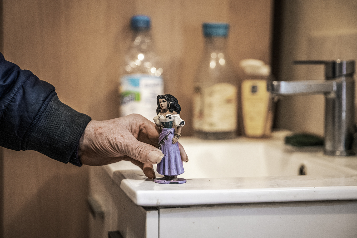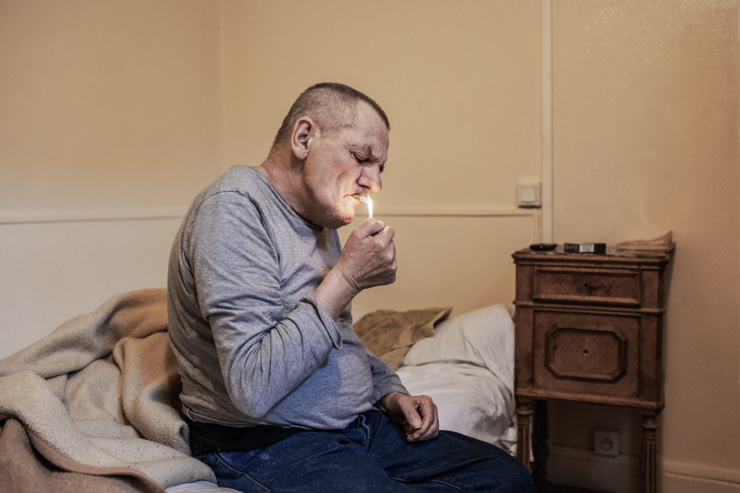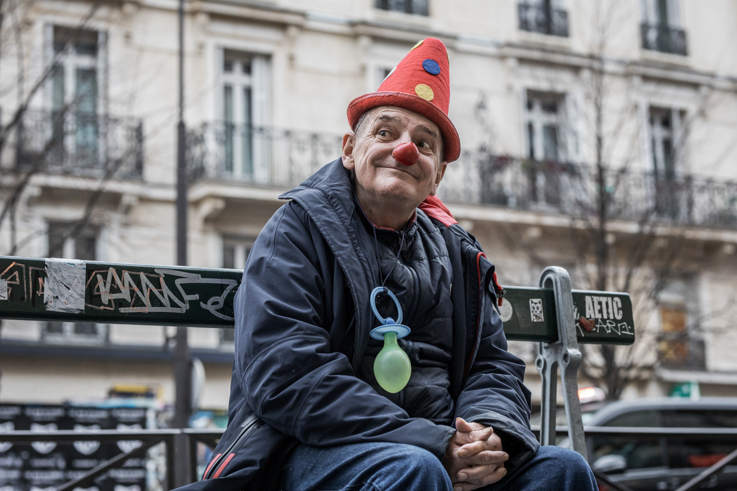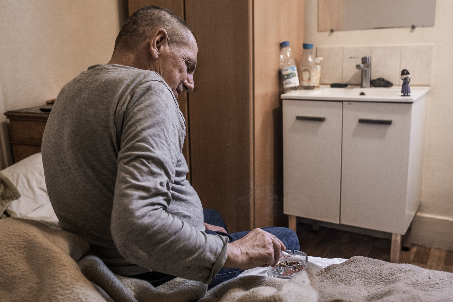 Joël, 65 ans, originaire du Nord-Pas-de-Calais, vit depuis 3 ans dans un hôtel social à Paris 11ème. Boulanger de profession, il est aujourd’hui à la retraite ; il ne possède plus rien et se soigne contre un cancer de l’estomac. Il a tout perdu après son divorce alors qu’il avait une maison et des terrains. Lorsqu’il était petit il faisait clown avec sa famille de gitans.